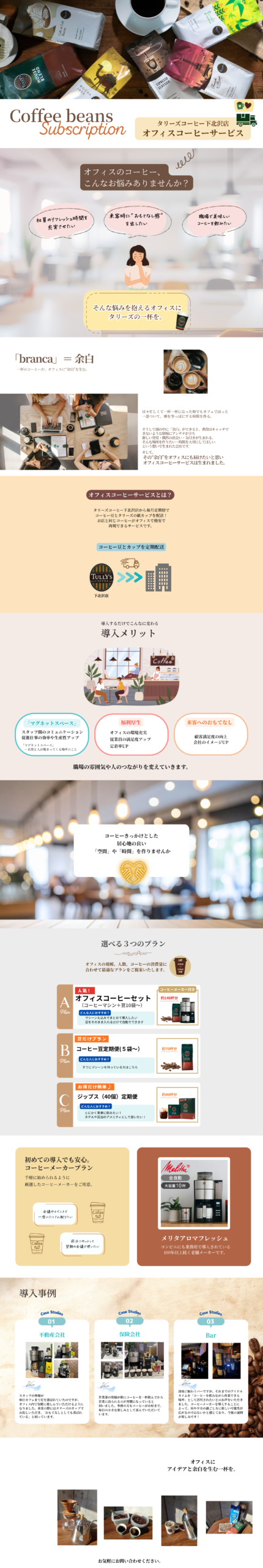 コーヒー豆定期配送サービス タリーズこだわりの新鮮なコーヒー豆を、定期配送でご自宅にお届けする便利なサブスクサービスです。 人気ブレンドをはじめ、香りや焙煎度の異なる多彩なコーヒー豆をセレクト可能。 忙しい毎日でも、本格カフェの味をおうちで楽しめます。 コーヒー好きの方はもちろん、プレゼントや法人オフィス向けにもおすすめ。 下北沢のタリーズから、お客様のライフスタイルに寄り添う「コーヒー豆定期便」を提供予定です。 お申し込みはこちら 資料請求はこちら